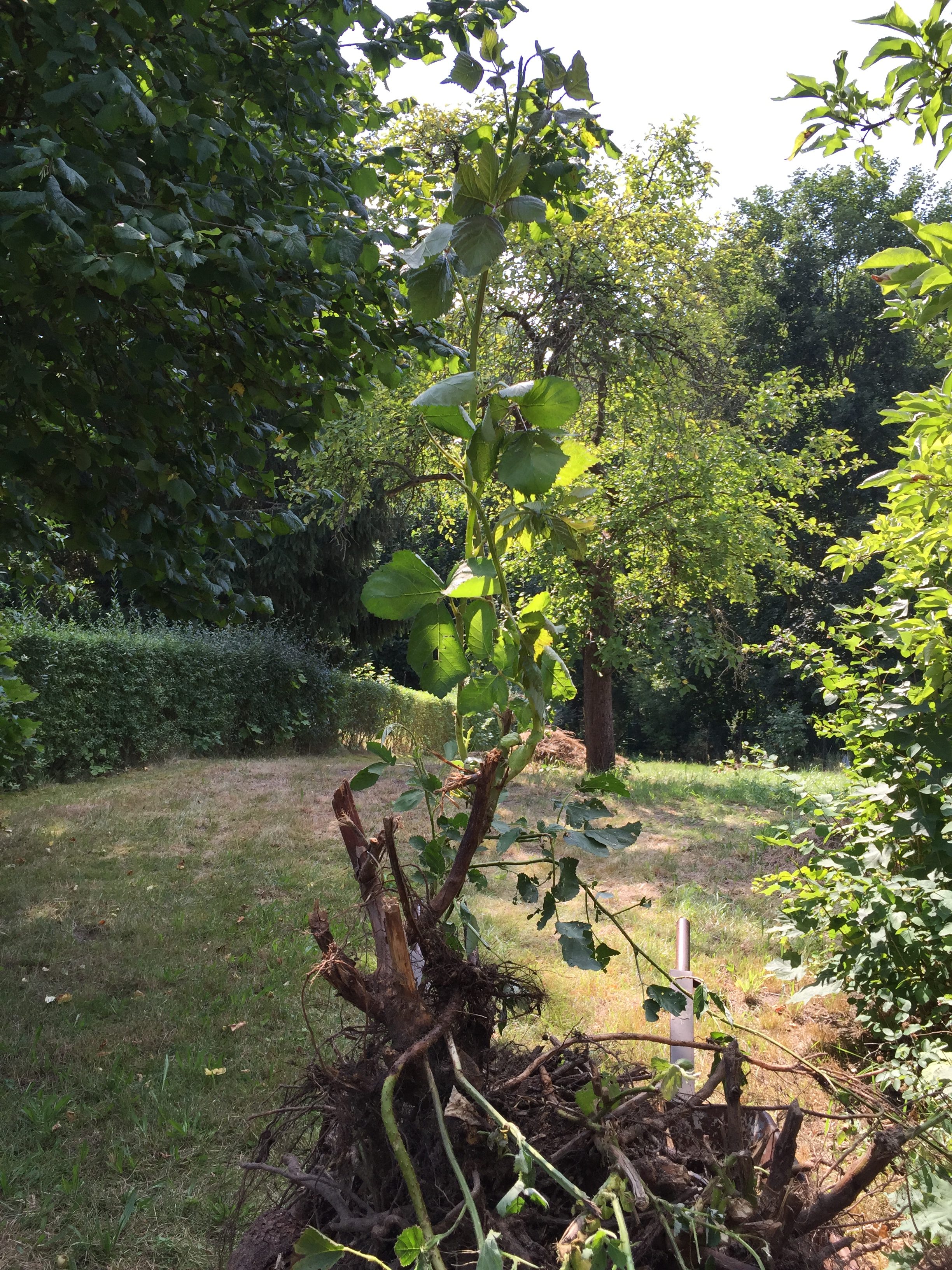 2. Ein ähnlich amüsantes Dasein führe ich seit Mai. Zuerst mittels Freischneider einen Baucontainer voll Gestrüpp entfernt. Seitdem alle zehn Tage vor Ort, um jedesmal drei bis fünf Wurzelknoten zu entfernen und mit einer Sense die jungen Triebe zu entfernen. Einen Einsatz wegzulassen, heißt neue Ranken mit bis zu einem Meter Länge.